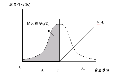 point)通常介於總負債和流動負債之間, [2] 也就是說,若公司資產價值低於違約點時,公司將會發生違約。