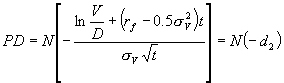 (2-7) 在違約機率公式(2-7)中,公司資產價值V與資產變異 是影響違約機率的最重要因素,然而卻無法觀察得到,因為在財務報表中之資產價值多為歷史成本,與目前的市場價值有所差異,所以公司的資產價值不能以財務報表中之資產帳面價值來計算,必須設法以估計的方式得出,才能進一步計算公司之違約風險。Merton模型就(2-1)式資產價值與股權市價的關係來探討,藉由已知的股權市價和股權變異,來反推資產價值與資產變異,但由於(2-1)一條方程式無法解出兩個未知數,因此必須再引入一個關係式才能解聯立得出這兩個未知數。