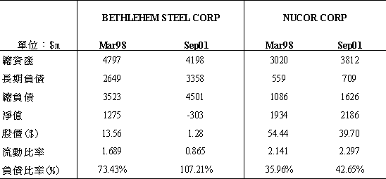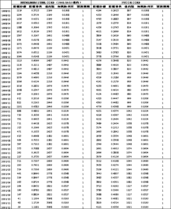 接下來將兩家公司的主要財報資料、負債比率與股價進行初步比較,如表3-1所示,因違約個案Bethlehem於2001年10月15日違約,故取違約前三年(1998年第一季)與違約前一季(2001年第三季)的資料進行比較,以說明公司在違約前財務資訊的變化情形。