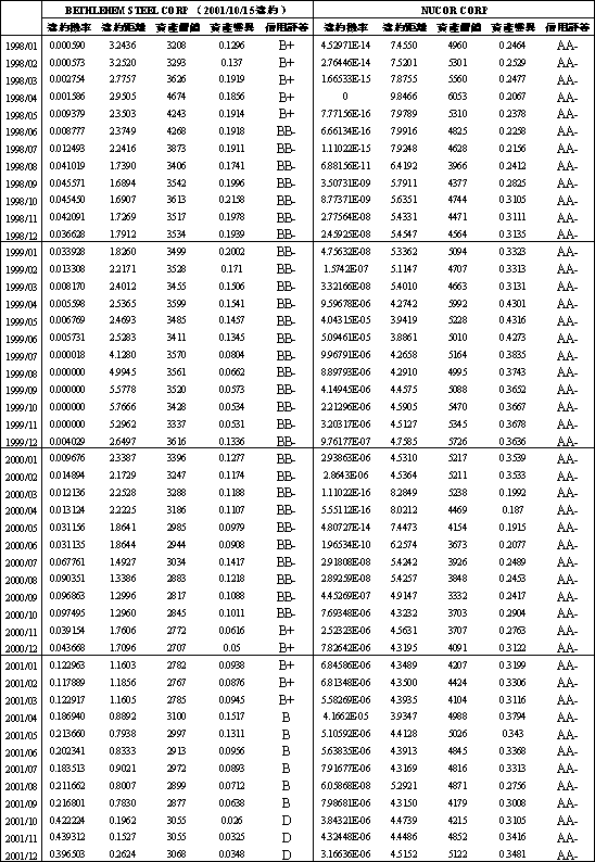 註:流動比率=流動資產/流動負債、負債比率=(總負債/總資產)*100%。 3.2 預警能力分析 本節主要目的在探討Merton模型之預警能力,並與信用評等比較及時預警之特性。首先說明研究方法,我們以違約公司Bethlehem以及其同產業且規模近似的正常公司Nucor為研究對象,根據前文Merton模型的介紹,以公司的股權市價和股權變異求算發生違約時點前三年期間每月的資產價值、資產變異、違約距離以及違約機率,違約機率預測期間為一年,違約點為流動負債加0.5倍長期負債,並將兩家公司的違約風險投入變數與估算結果及信用評等彙整如表3-2與表3-3。
