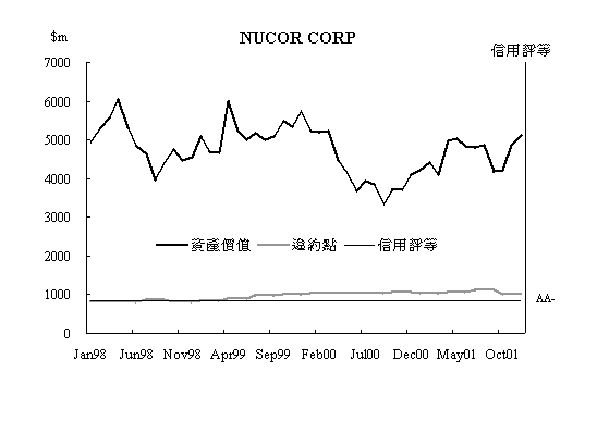由於Merton模型定義違約風險會隨著資產價值愈接近負債而增加,直到當資產價值不足以償付債務時,即發生違約,因此將公司自違約發生前三年起的資產價值、違約點及信用評等繪成趨勢圖,探討Merton模型根據違約定義所表示的違約發生時點與信用評等調整時間的關聯,圖3-1為Bethlehem自2001年10月申請破產保護前三年起的違約狀況趨勢圖;而圖3-2則為正常公司Nucor同一時期的信用狀況趨勢圖。由圖3-1整體看來,Bethlehem的資產價值與違約點較為接近,表示公司的槓桿程度很高,違約風險較高;再觀察圖3-2