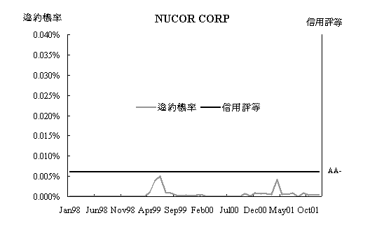 而對照正常公司Nucor的信用狀況圖,Merton模型得到之結果與該公司的信用評等狀況相當,由此可知Merton 模型在反應危機公司上不但能掌握時效,且不至於過度反應或是太保守而有嚴重誤差產生。